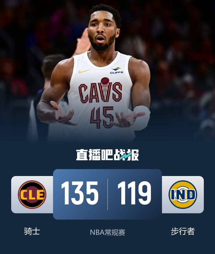 比赛开场,骑士率先发力,打出一波9-0建立领先优势,此后稳扎稳打维持分差,首节结束37-25领先。次节一上来骑士延续状态,将分差拉开到20分,但步行者很快作出调整,回应一波小高潮蚕食分差,半场结束54-66落后。易边再战,双方陷入拉锯战,交替取分,分差在十分上下波动,三节结束骑士领先9分。末节回来,骑士再次发力,外线连续投中,米切尔在进攻端予取予求,帮助球队重新将比分拉开,步行者无力再追回比分,最终骑士135-119力克步行者。