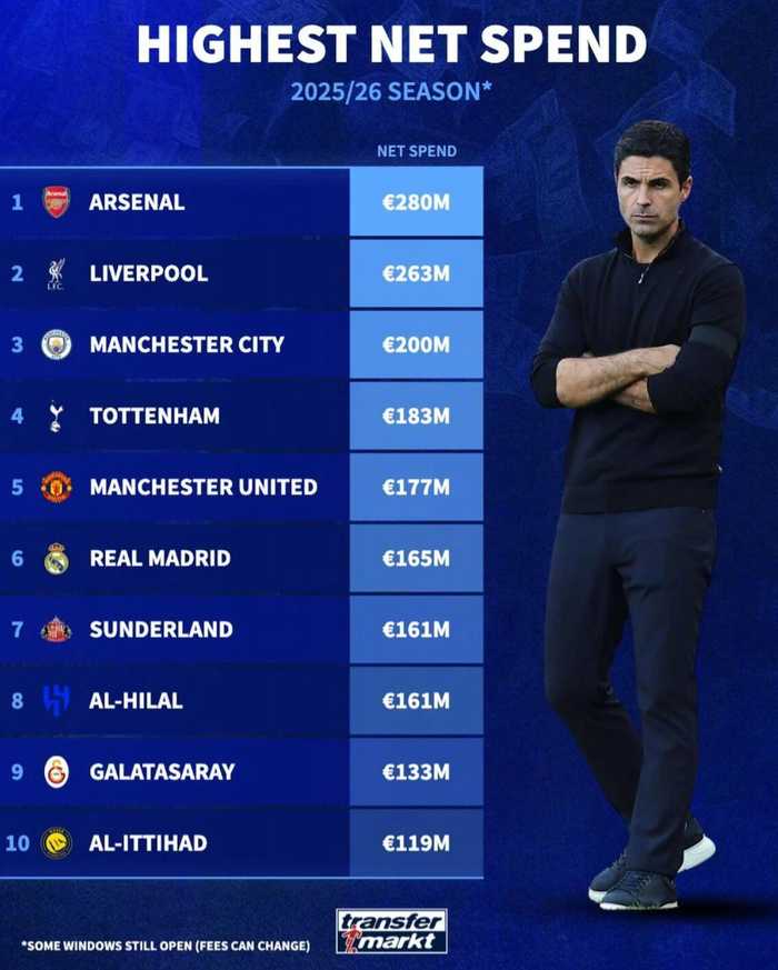 阿森纳领跑2025-26赛季俱乐部转会净支出榜,利物浦曼城紧随其后